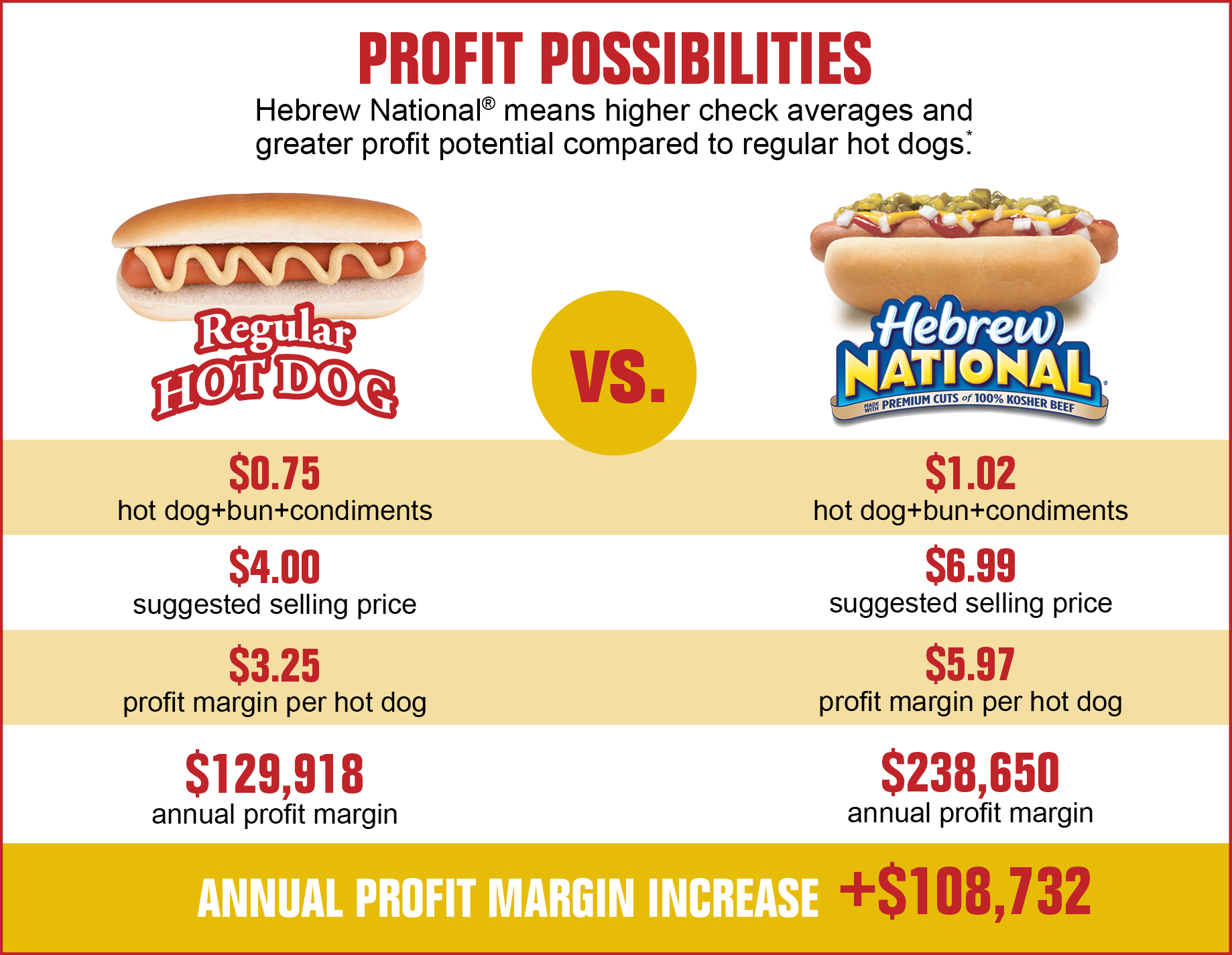 *Calculations made using 6” 6/1 beef hot dogs. Buns and condiments are estimated at $0.50. Actual product costs, pricing and profit margin will vary depending on market. Estimated numbers based on 5,000 annual pounds purchased and 39,975 hot dogs sold. Profit margin increase not guaranteed. For example purposes only.